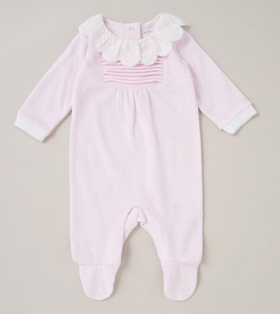 Embroidered frill collar velour all in one with poppers to the back and legs.